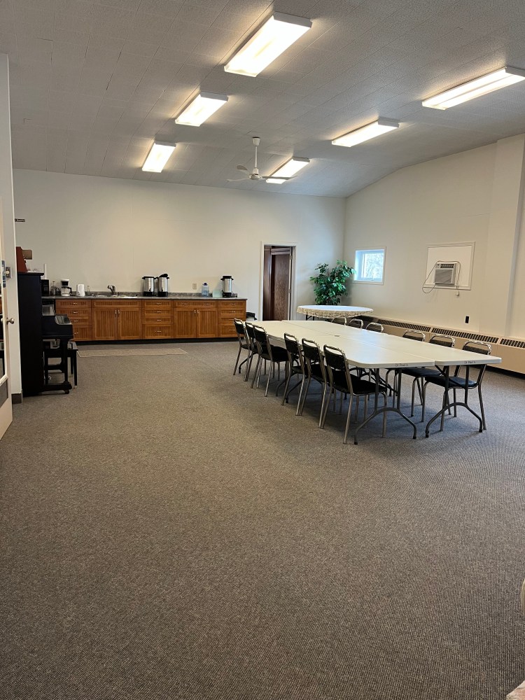 $60.00 for one time slot & $40.00 for kitchen $90.00 for two time slots & $40.00 for kitchen $120.00 for three time slots & $40.00 for kitchen 48’L x 34″W approx.; seats 125 people